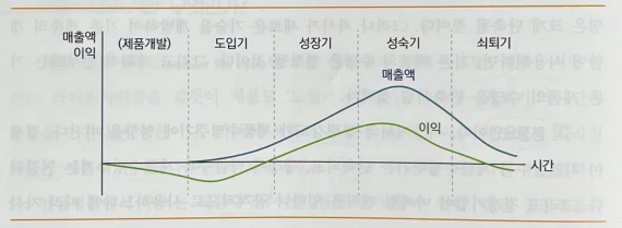 도입기에는 매출이 서서히 증가하다가, 성장기에 매출이 급격하게 증가, 성숙기에는 많은 고객이 구매한 상황이기 때문에 매출 성장이 둔화되며, 쇠퇴기에는 매출액이 급격히 하락하게 됩니다.