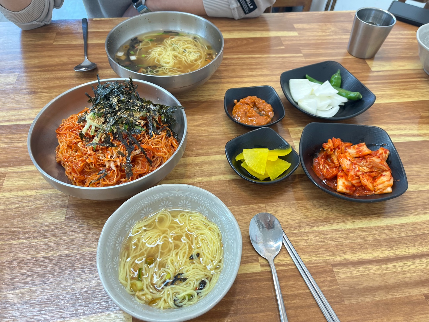 잔칫국수 곱빼기랑 비빔국수 곱빼기를 시켰다. 이때가 거의 1시가 다되어 갔는데 저녁은 늦게 먹자며 둘 다 곱빼기로!