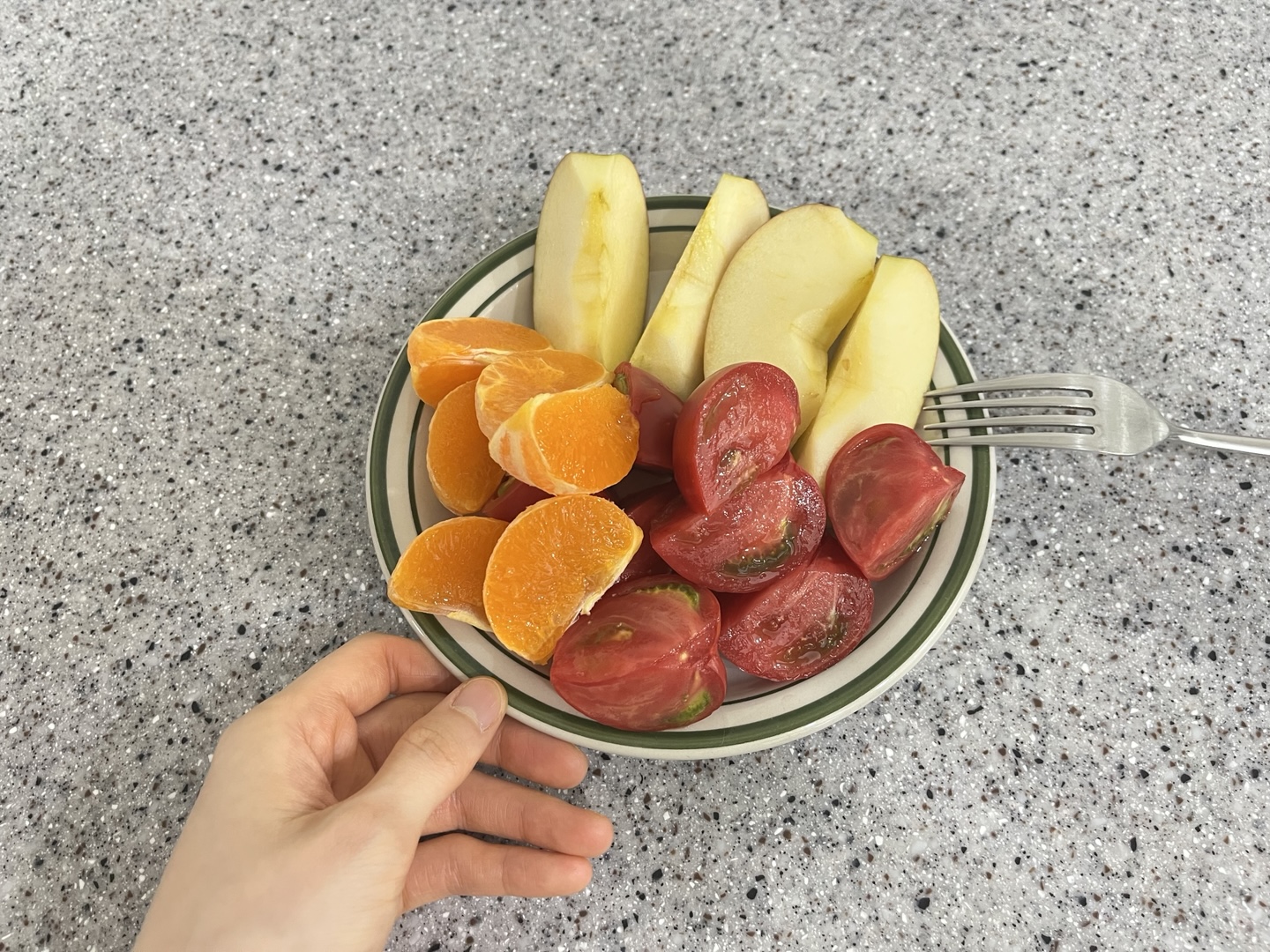 전과 비교하자면 과일의 양도 좀 줄였다. 사과 반 개에 작은 과일 몇 개를 함께 먹는다. 요즘 제철인 짭짤이 토마토, 작은 황금향도 하나.