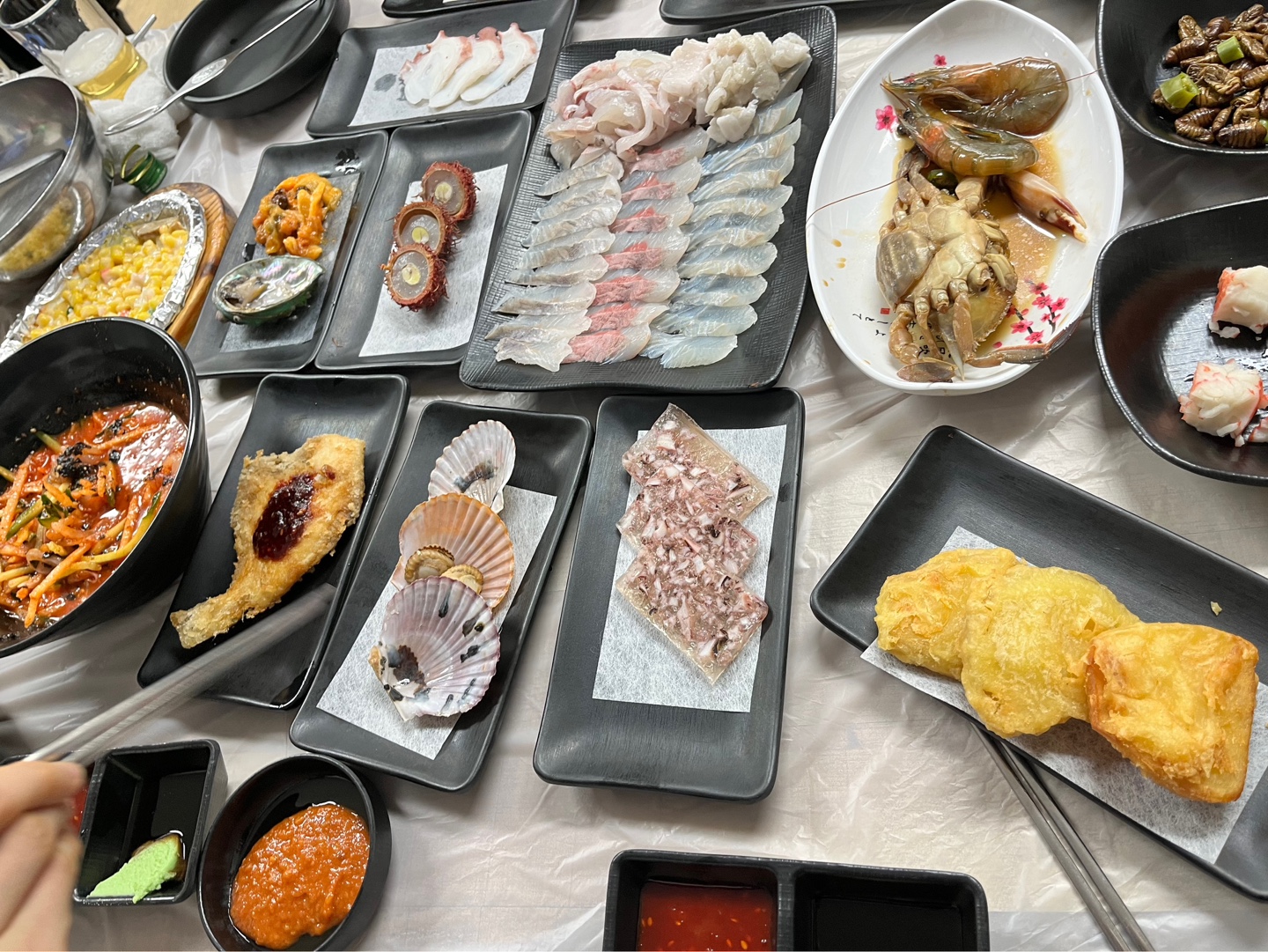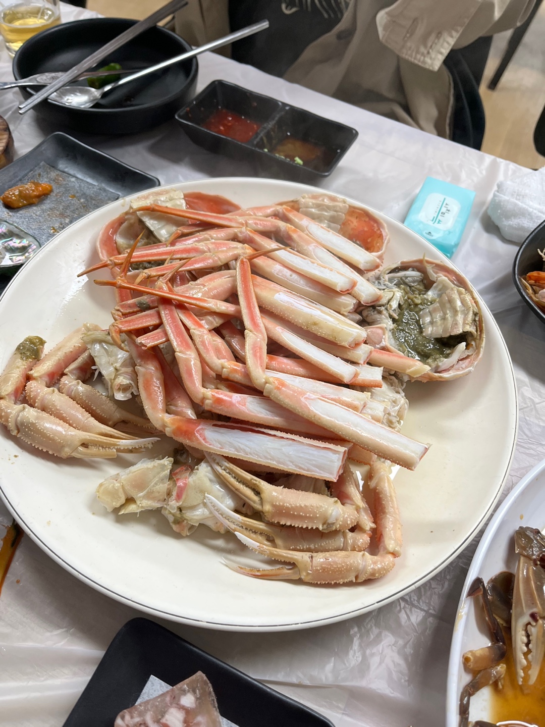 바닷가라 회가 신선하긴 했지만 대게 3인세트에 13만 원 이었던 걸로 기억하는데 대게 사이즈가 좀 작아서 당황했지만.. 회랑 전복, 멍게 밑반찬 등을 계속 리필해 주셔서 그래도.. 잘 먹고 나왔다.
