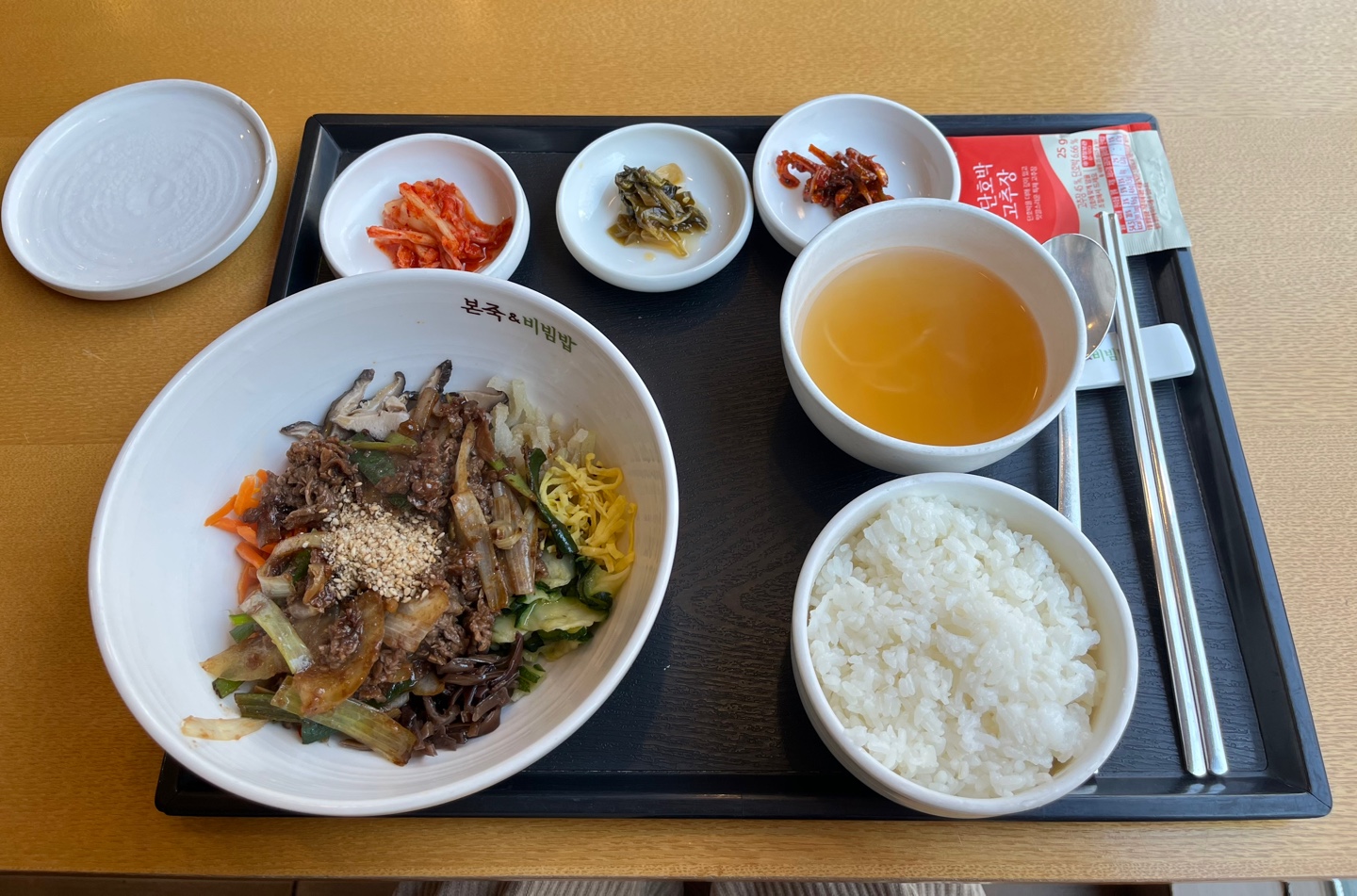 소불고기 비빔밥을 시켜 창가자리에 앉았다. 저번달이였나 퇴근하고 집에 가서 밥 하기가 귀찮았던 날 본죽에서 비빔밥을 먹었는데 아니.. 너무 꿀맛이라서 그때가 생각이 났다. 오늘도 편한 점심 한번 먹어보자!