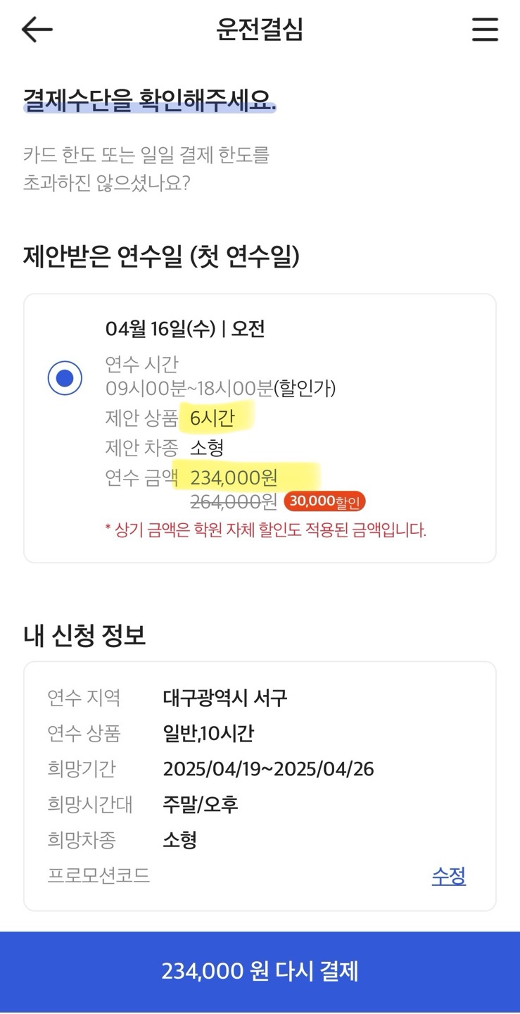 기본 연수는 하루에 2시간씩 총 6시간은 받아야 된대서 직장인인 나는 주말 중 토요일 2시간씩 3주를 받기로 했다. 운전결심 어플로 결제하니까 3만 원 DC도 받았다.