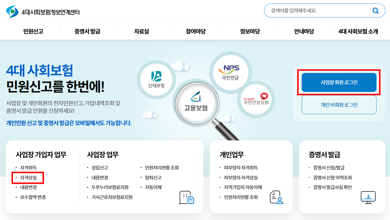 4대사회보험정보연계센터 사업장 로그인 후 자격상실로 들어가줍니다.
