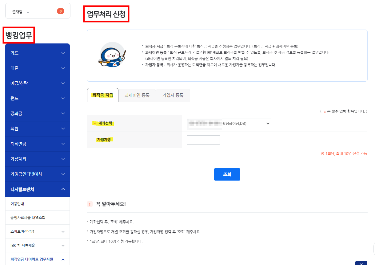 저희 회사의 경우 기업은행을 이용하는데 퇴직급여지급신청서를 팩스 전송 후 신청할 수도 있지만 기업은행 홈페이지에서 퇴직연금을 바로 신청도 가능하더라고요.